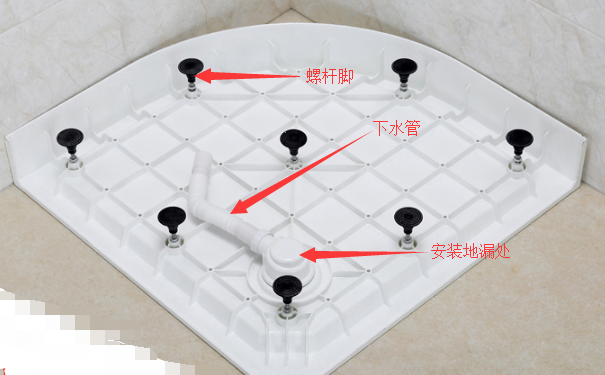 1、首先將下水管已經(jīng)螺桿腳蹬底盆零配件組裝好,將地漏安裝好各個(gè)待用。