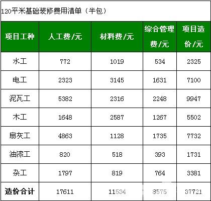 120平米的房屋裝修所需要花費的費用是多少呢?其中的費用支出包括:人工、水電、泥瓦、扇工、油漆、雜工中的人工費以及材料費用、管理費。裝修公司的半包裝修是包工不包主材,材料方面由業主自主把關。下面我們一起來看看這個花費37721元的120平方米房屋裝修預算是怎么樣的。