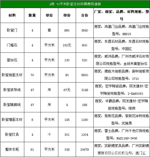 在該套預算方案中,戶型結構是4房,4房加起來的實用面積有70平方,您可以根據自己房間的實際大小在做相應的預算對比,臥室裝修所需要的主材主要是臥室門,門檻石,窗臺石,臥室地面主材,臥室波導線,臥室踢腳線,臥室墻面主材。以下所需要的裝修費用因您選擇的不同品牌與面積大小有所差異。