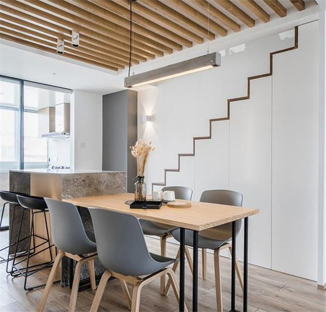 制作工藝:正常樓梯,下方空余部分做成定制柜,增加儲物空間,色彩簡單大方。