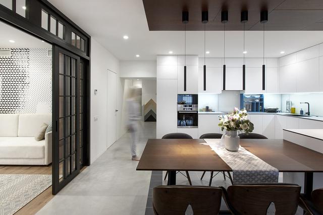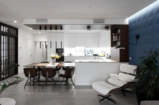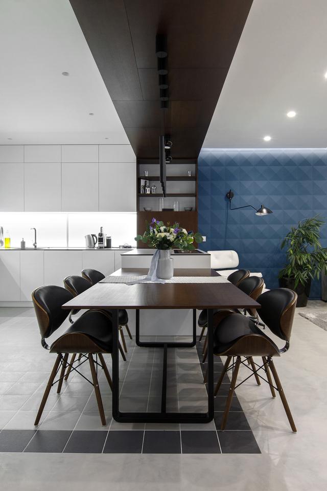 在烏克蘭,一對年輕夫婦的的115平方米公寓由于其布局,缺乏自然光線,使房子的后部陷入陰影。所以他們需要明亮的照明方案和巧妙的室內設計。設計師提出了一系列的照明解決方案,包括廚房的LED背光板,可以將明亮光線投射到每面墻上的嵌入式周邊照明,以及通過法式門將光線引入客房。盡管房子的色調很暗,但這個設計團隊并沒有回避漂亮的深藍色插畫,也沒有回避活的綠色。來看看國外的設計師是如何做的!