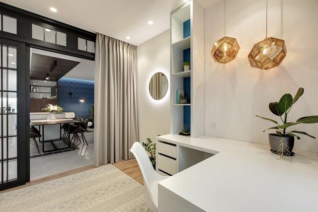 客房還包括家庭辦公室,它配備了一個內置的桌子和附加的架子。兩個美麗的幾何吊燈懸在工作臺上。
