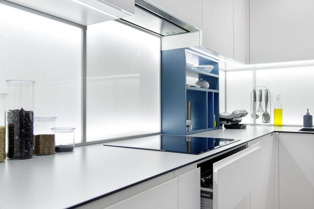 一排LED照明面板組成了后擋板,消除了白色廚房的所有陰影。一組開放式廚房的架子被涂上了藍色,以配合開放式房間其余部分的色彩。