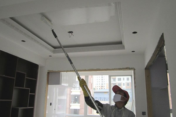 面漆施工的順序:先吊頂、線條,后墻面。墻面上漆至少要上兩遍,第一遍涂料可加5%~10%的水,方便墻壁吸收,第二遍面漆可不加水,與第一遍涂層有一定的間隔時間。滾涂時需要同時使用粗細兩種滾筒刷,粗滾筒刷先行、細滾筒刷隨即跟上。用粗滾筒將油漆均勻涂在墻壁,再用細滾筒在粗滾筒刷過的地方,重刷一遍,讓墻面油漆變得細膩,并刷出所需花紋。