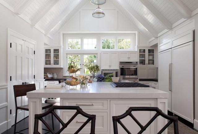 一個全白色的木天花板是一個美麗的添加到任何廚房,它有一個光滑的木材清潔線,同時寬敞和開放。再配上其他的白色裝飾,讓整個房間明亮起來。