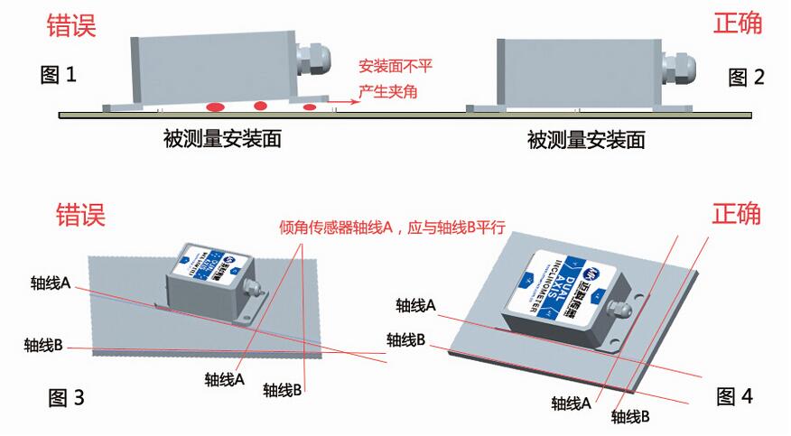 水平安裝,顯而易見就是把傾角傳感器水平放在一個平面上,比如地面、桌面等,垂直安裝則是把傾角傳感器安裝在垂直于大地的一個穩定的面上,比如墻面等。