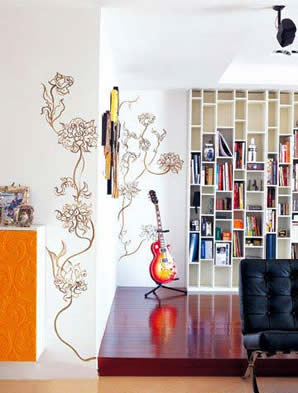 ??? 簡約風格的家中,往往蘊涵著一語道破的驚喜,如同一個不顯山露水的人,卻可能擁有耐人尋味的人格魅力。二者另一個共同點在于,都需要我們去發(fā)現和探尋。進門正對著的墻壁,是給來者第一眼的印象,起初不敢畫,因為這個位置太重要,太顯眼。丙烯、金漆,出來后的效果令人滿意,于是它們繼續(xù)“攀爬” 到客廳的墻面上。