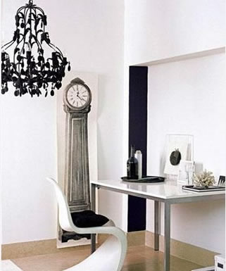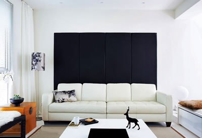 ??? 一條簡單的黑色長條色塊增加了角落的深度,本來容易被忽視的角落反而成為了居室里的亮點。其它配飾的選擇除了顏色非黑即白之外,最好選擇不同的材質和質地,這樣就會有既豐富又單純的效果。
