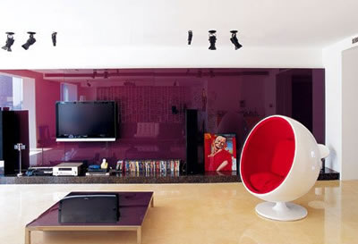 ??? 客廳:視聽區(qū)域干凈利落,沒有多余的修飾,充分突顯了刻意強調的功能。卸得多,裝得少 完全開放的空間里,四白落地,素凈、淡然,卻有股凜冽的豪爽,大塊地磚將這種氣質襯托得更加鮮明,背景墻雖然用了紫色,依然與外部活動區(qū)域保持感官上的統(tǒng)一。