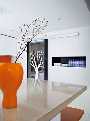 ??? 一間小的廚房間,由推拉門隔離。玻璃門上的白色樹枝圖案,與屋內的白色統(tǒng)一一致。