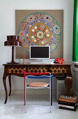 ??? 濃濃復(fù)古味的臺(tái)燈、電話和翻新的書桌,幾何圖形變換組合而成的精美插畫,讓空間充滿了特色。這樣的空間搭配上白色地板讓整體效果更和諧寧?kù)o。