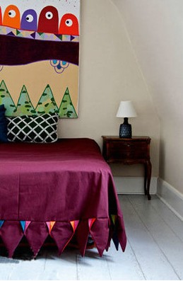 ??? 簡(jiǎn)單的線條,鮮艷的色彩,插畫加上床品打造了一個(gè)充滿童趣的兒童房。搭配簡(jiǎn)潔的白色地板,多了一份寧?kù)o與恬淡。