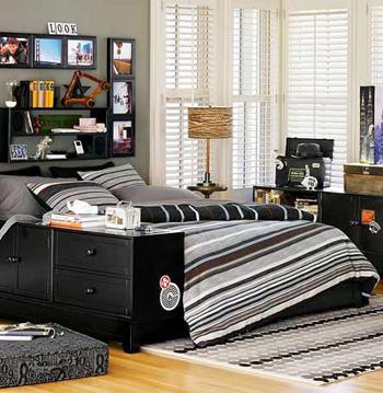 ??? 上一幅場景是米色系主調,這一幅場景是深灰色系為主調的臥室搭配,地毯的選擇與臥室整體色調保持一致,臥室的主題效果便躍然眼前……