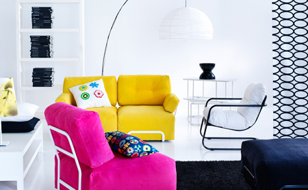??? 這是一幅客廳的場景,很明顯主人是時尚一族,無論是從個性的落地燈具還是從色彩搭配上都可以看出主人個性講究的一面。整個客廳布置十分簡潔,卻不單調。而主人對于地毯的選擇也是相當大膽,純黑色羊毛塊毯在材質和顏色上都與整個客廳的調調“不協調”,而正是這種嚴重的不對稱和極度反差的對比,使居室的品位升華到另一個高度,白色地面、白色墻面、紅黃家具……如果沒有這一塊黑色小毯的陪襯,整個屋子就亮的扎眼了……