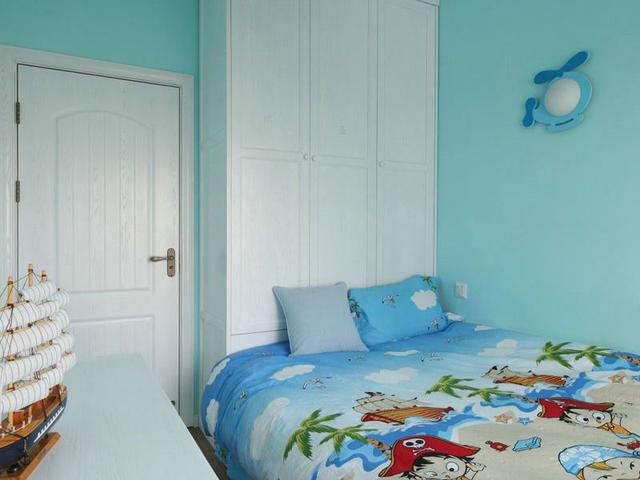 次臥的裝修裝成了榻榻米的臥室,這種榻榻米臥室的格局設(shè)計很到位,畢竟空間實在是小,所以沒有辦法打造成榻榻米,確實節(jié)省了很多的空間,把兒童房裝的比較溫馨,墻壁用的是天藍色搭配白色的衣柜和床鋪,色彩十分的小清新。