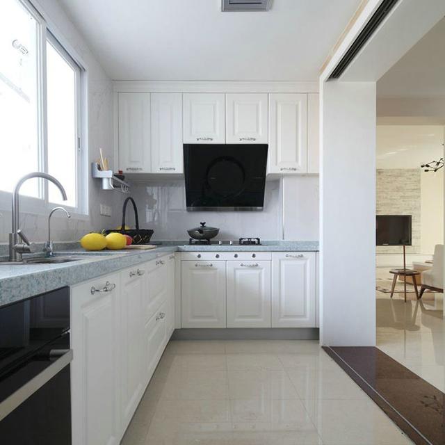 開放式的廚房裝修,打造的是一個轉(zhuǎn)角設(shè)計的櫥柜,這樣的白色大櫥柜搭配高級灰的臺面,把廚房裝的十分的上檔次,面對開放式的格局設(shè)計,只是做了一個門框,這樣的廚房以后烹飪會顯得更方便舒適。