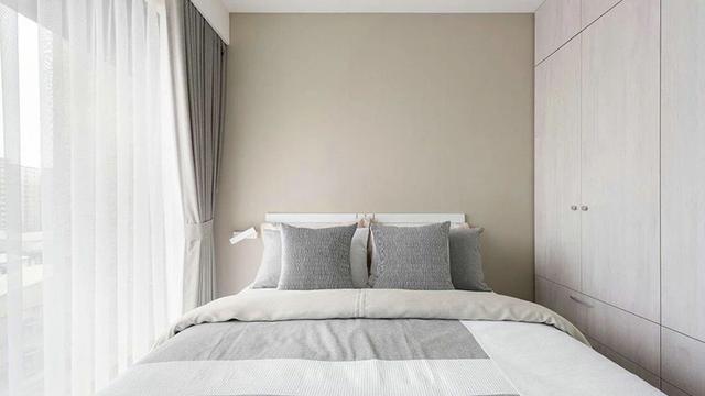 臥室裝修很簡約,顏色用的也是很淺,墻壁是一種純色的淺色調,搭配的是做舊感的實木衣柜,搭配白色的雙人床,灰色的窗簾搭配,整個臥室沒有其他很亮麗的色調,給人一種很樸素的素雅感,反而看起來很休閑愜意。