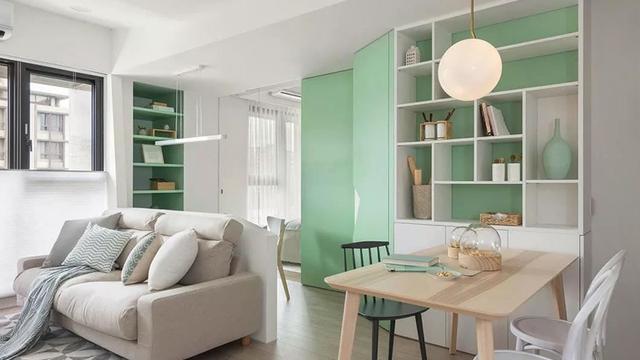 108㎡的新房,運用綠色顏色進行色彩點綴,整個空間會顯得更加富有青春活力感,整個戶型墻壁的裝修是全屋的亮點,運用的是不規則的墻壁隔斷設計,是一種綠色的背景墻,搭配白色的儲物柜子,這樣顯得很清新簡約。
