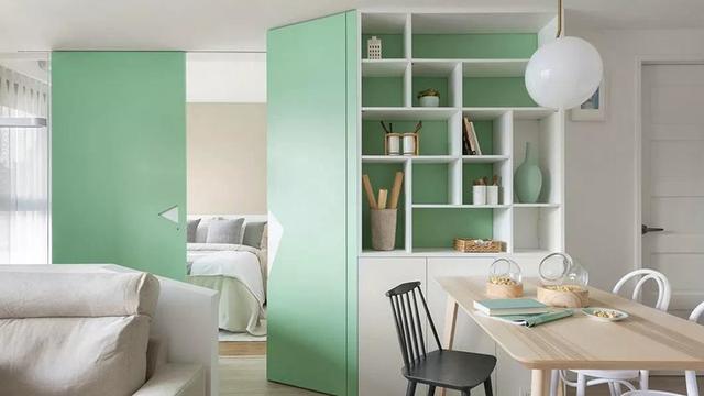 餐廳的背景墻壁是清新綠色,搭配的是入墻式的白色隔板儲物柜,這樣的柜子是用來當做酒柜使用,可以實現各種餐廳物品的收納擺放,這樣白色與綠色的搭配簡約清新極了,看著就讓人覺得眼前一亮,緩解視覺疲勞感很自愈。