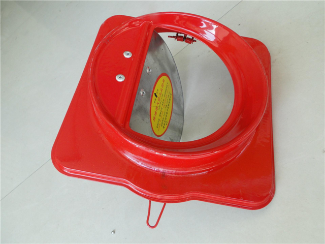 2、在其閥體進風口處裝有一塊擋油網,網下有一接油盒,擋油網與閥體進風口以活動抽形式連接;擋油網之后的止逆閥腔體內裝有一整板式風門;進風口管體套裝在止逆閥腔體內;風門通過固定在進風口管壁上的偏心軸裝于管體上,可繞此軸開啟和關閉止逆閥出風口。