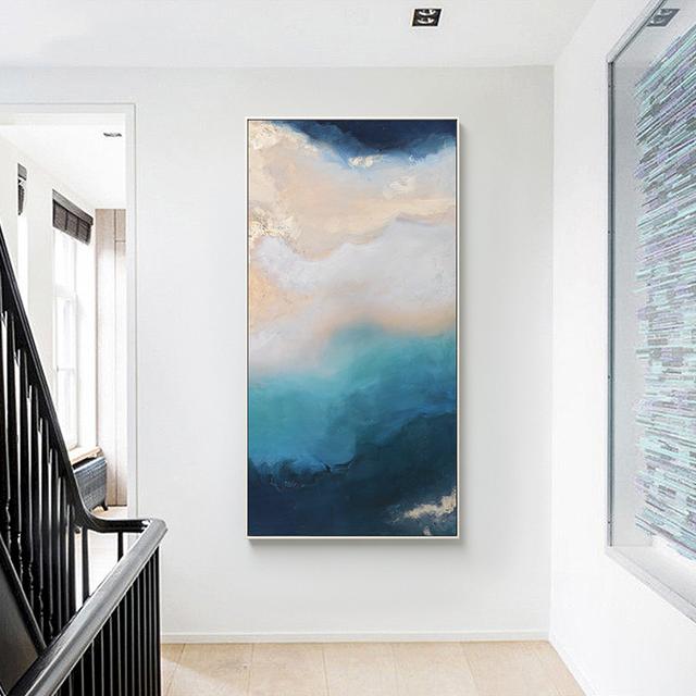 我個人更喜歡這樣的壁畫,裝飾玄關我覺得更富有色彩感,給人眼前一亮的視覺感,抽象的藍色的花簇的一種壁畫,藍色與白色空白的相互搭配,視覺盛宴的一種既視感,可以用于多種不同風格的玄關進行墻壁裝飾美化。