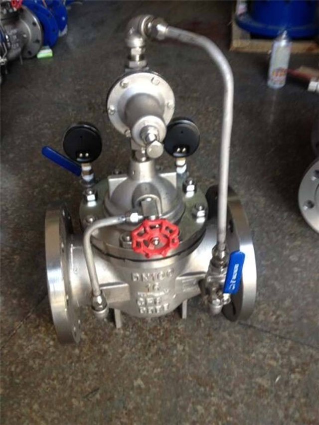 當管道從進水端給水時,水流過針閥進入主閥控制室,出口壓力通過導管作用到導閥上,當出口壓力高于導閥設定值時,導閥關閉,控制室停止排水,此時主閥控制室內壓力升高并關閉主閥,出口壓力不再升高。