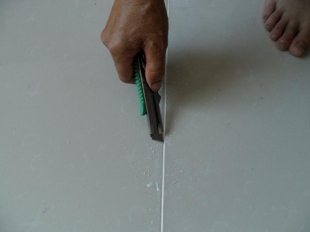3、用美工刀將瓷磚縫刮出1-2mm的縫劑,用毛刷將縫隙刷干凈(注意將瓷磚也清理干凈),這個過程中我們尤其要注意的就是要耐心,細心進行,不能毛毛躁躁,否則做出來的效果會十分的不理想。