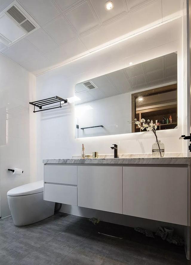 主臥衛(wèi)生間的設(shè)計(jì)非常的時(shí)尚、大氣,鏡子的四周都做了藏光的設(shè)計(jì),大理石的臺(tái)面和灰色的地面構(gòu)成一種簡(jiǎn)潔、大方的感覺。