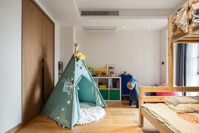 兒童房內(nèi)留出了角落空間給來(lái)孩子打造娛樂(lè)區(qū),帳篷加上地毯、可愛的玩偶、小矮柜等等結(jié)合起來(lái),讓這個(gè)兒童房空間既實(shí)用又充滿了童趣。