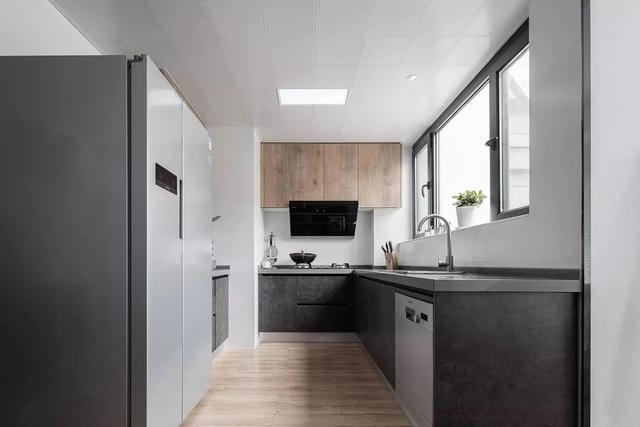 灰色的做舊櫥柜搭配木色的做舊吊柜,U字型櫥柜布局的廚房空間,給人一種簡(jiǎn)約而又復(fù)古的感覺,非常有格調(diào)。