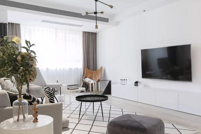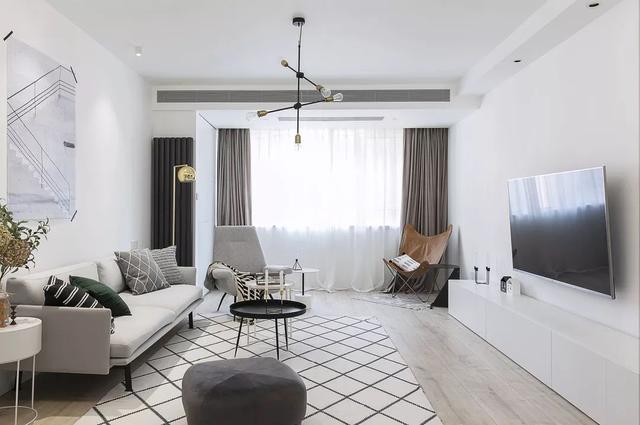 客廳墻面和吊頂都沒有做,省了好大一筆,重點放在了軟裝上,淺灰色的沙發配上米色的格紋地毯,是不是看上去很舒服呢?
