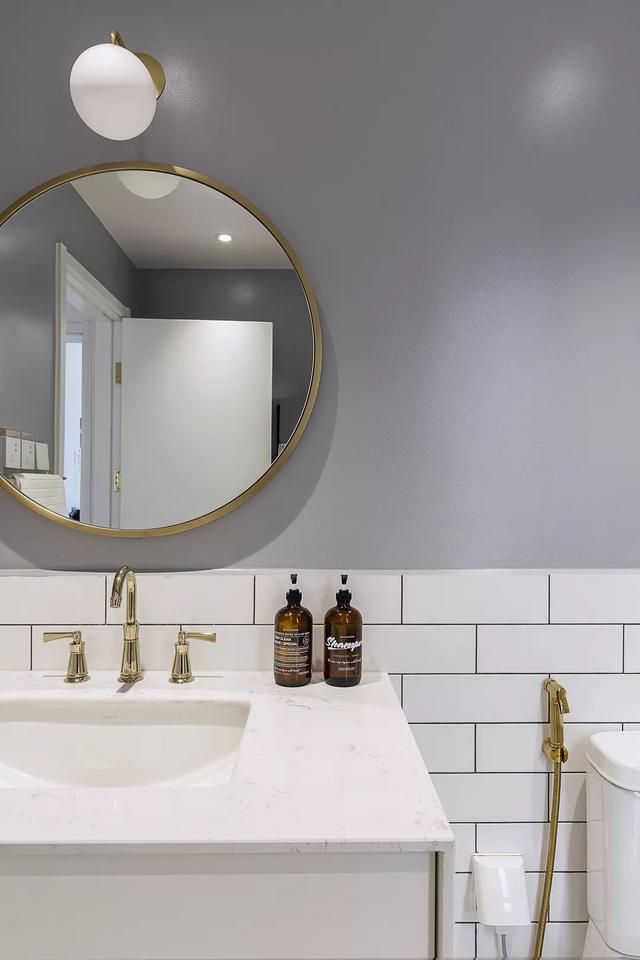 衛生間和廚房風格差不多,這樣讓空間也更加協調,墻面裝了一面金屬邊框的鏡子,頓時感覺精致了。
