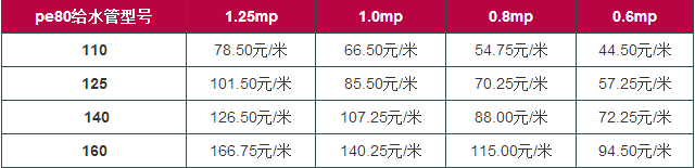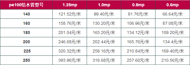 隨著社會的進步,經濟持續的發展,現在的pe給水管連接技術早已非常成熟可靠,pe給水管的漏損率不到十萬分之二,遠遠低于其它材質管道漏損率的2%-3 %,在很大程度上提高了管道的安全性、價值性、經濟效益,以上說了這么多相信大家最為關心的還是pe給水管的具體價格,下面就是小編對于不同型號的pe給 水管價格表的介紹,希望對大家在pe給水管選擇上有所幫助。