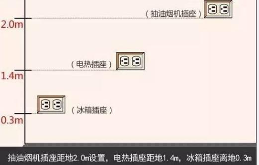 3、大功率廚房電器插座,油煙機的一般最高,是至少2米;其次第二高該是熱水器的至少1.4米;冰箱插座則可只高出地面30cm-50cm左右!