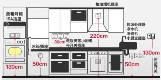 4、臺上插座,一般不能在小家電的正上方!它們都要高出臺面30cm,同時不能靠近水槽。而臺下插座離地也要至少50cm高!