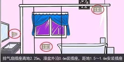 3、衛浴最高插座,一般屬于頂部排氣扇,離地2.25m;給吹風機、電動剃須刀用的就是洗手盆旁的,離地該1.5m左右;而靠近淋浴區或浴缸的插座,像馬桶邊的,大概離地0.6m左右。