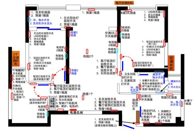 首先,來看看全屋的開關(guān)插座布局,接下來我們再詳細(xì)說各個(gè)區(qū)域。