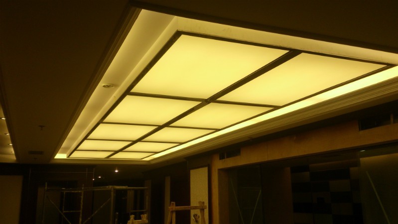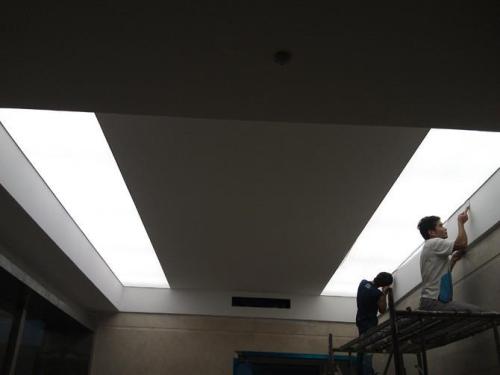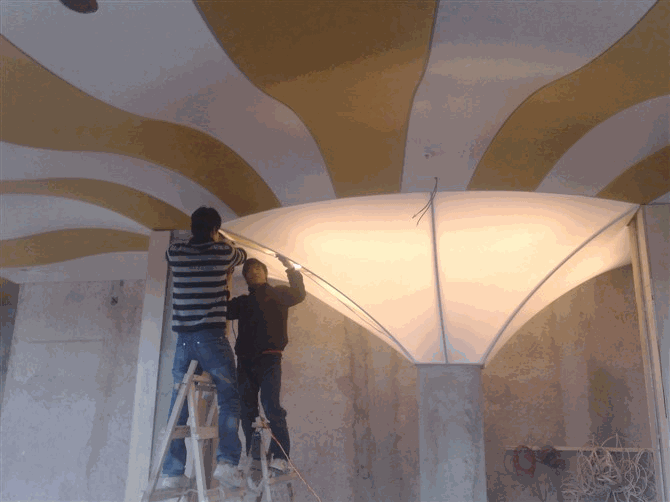 7、安裝軟膜天花拉膜天花拉蓬天花柔性天花透光膜造型天花藝術天花洗浴天花,開光纖燈尋找光纖頭的光點,并用尖頭電烙鐵在光點上開孔,調(diào)整光纖頭在軟膜的水平位置。