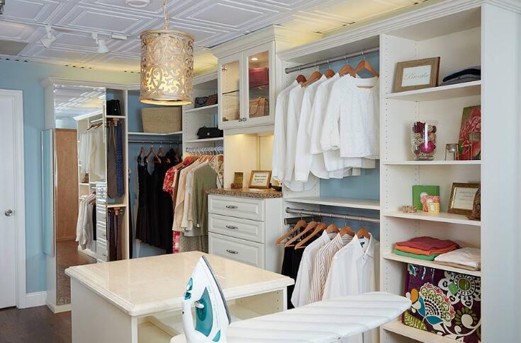(2)獨立的衣帽間,設計一定要合理安排燈光、色調等元素,展現歐式的優雅質感。使之既融入室內整體風格,又保持自己獨特的情調,體現一個優雅而知性的女性空間。