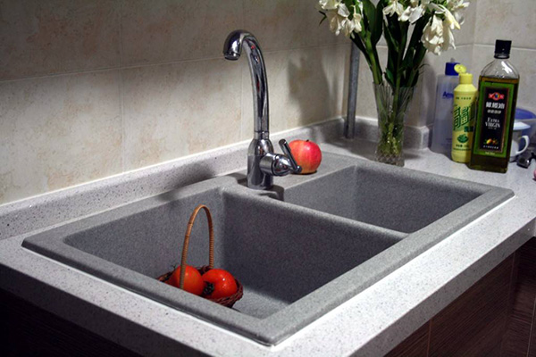 石英石和人造結晶的水槽也非常時髦,它們都是人工復合材料的一種,是由80%的純正花崗巖粉與20%的烯酸經過高溫加工后成型的。它圖案豐富,選擇性大,耐腐蝕,可塑性強,具有一定的吸音功能,轉角處沒有接縫,表面也比較光潔,與不銹鋼水槽的金屬質感相比,它更加溫和,而且亞克力有豐富的顏色可供選擇,有別于傳統的色調,布色均勻,用色夸張大膽,可以說獨具個性,它質樸、原色的另一面也為某些崇尚自然風格的家庭所喜愛。