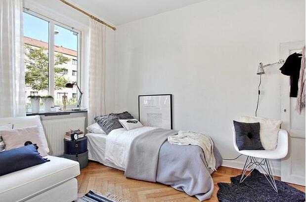 (1)冬日牛奶色調設計方案。這種簡約風格的單身公寓設計是許多人心中的首選,白色的墻面搭上淺色的木質地板再配上麻棉等天然的家居素材,給人營造出一種溫柔的氣氛。