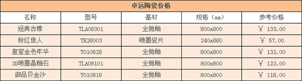 卓遠陶瓷產品線豐富,規格齊全,價格結構層次合理。拋光磚、內墻磚、仿石新產品都是全球首創,其中內墻磚產品更是以市場的潮流花色以及配套贏得了廣大消費者的認同和喜愛,“酷紀元”成為了內墻磚市場的后起之秀。