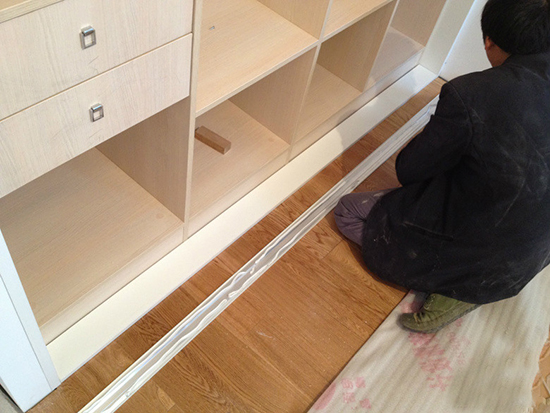 清理衣柜安裝位雜物,左右各站一人,衣柜向后稍斜,用力提起,向后移到所需位置注意不要刮花地板、墻壁。
