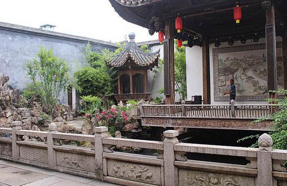 水榭戲臺整個水池面積有56㎡,池內錦鯉、金魚數量繁多。戲臺依水而建,坐南向北,占據30㎡空間。戲臺正面建樓閣,前廊后堂,穿斗式木構架,單檐歇山頂,可供聚會、觀劇或登高臨遠。戲臺后面還有化妝室,左右兩側有酒樓,整體設計精細、風格獨特。