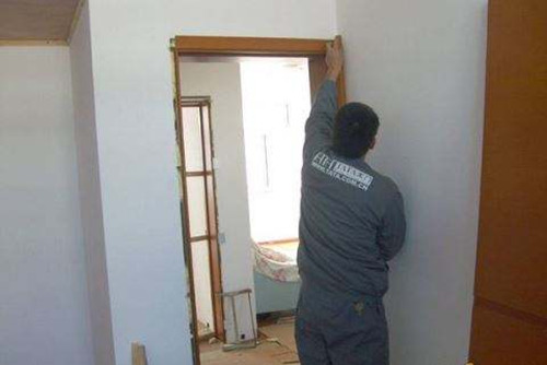將門套裝進洞內,然后用小木條將門套四周大致固定好,而門套兩邊要和墻體在同一平面上,再檢查門套整體和地面是否垂直,門套的頂板和兩立