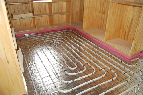 地面鋪上保溫層時,需根據實際尺寸來裁剪,確保切割的平整性整齊,最后再進行鋪設。注意板縫用膠粘貼牢固,并為管道留出空。