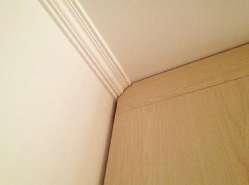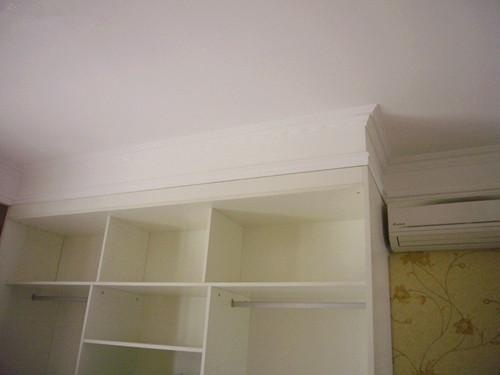 (3)先在衣柜上方吊頂10cm(這個厚度和你的頂角線厚度一致),然后再在吊頂側面加頂角線,衣柜等于短了10公分,但是不破壞頂角線的效果。