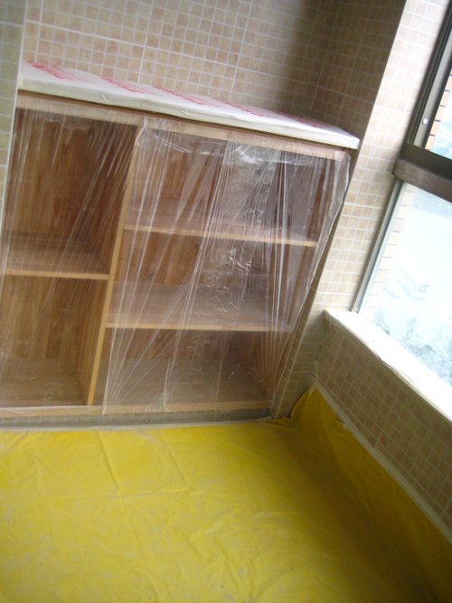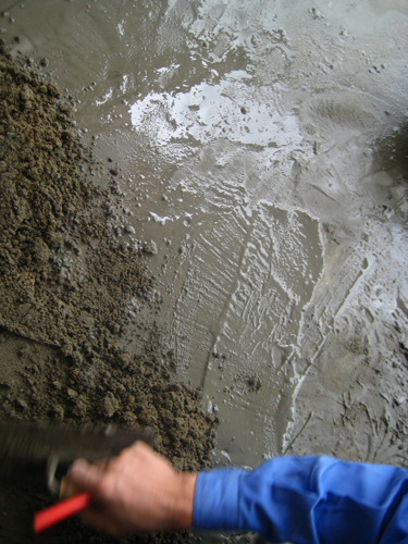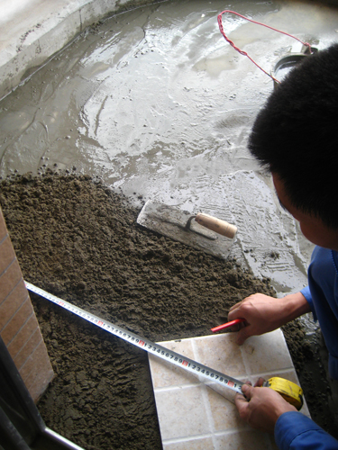 我們進門時工人師傅正要開始鋪地磚。他告訴我們做地磚前,地磚基層要用一比一的水泥黃沙掃漿,這樣可以防止原地面內的污垢、油泥等滲到外面,造成基層空鼓。