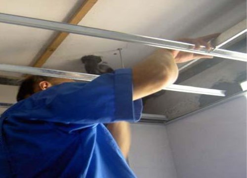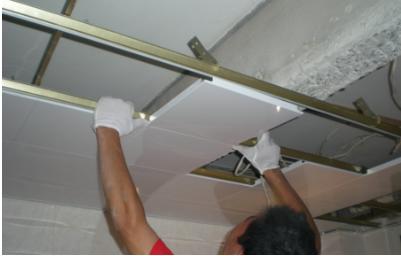 下吊桿及架置輕鋼龍骨,吊桿、龍骨間的距離要做到和面板大小一至。在頂部打膨脹眼并固定所有吊桿,吊桿下口與吊鉤連接好,再把主龍骨架在吊鉤中間并予固定,調節高度螺母使主龍骨底平面距收邊條上平面線3cm并緊固。然后,是付龍骨的安裝。根據實際的安裝長度減5mm截取所需的付龍骨,套上三角吊件,按圖紙要求把所有的付龍骨用三角吊件暫時掛靠在主龍骨上。