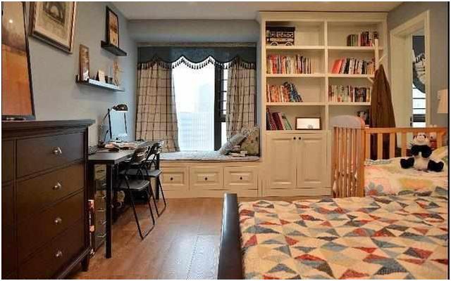 主臥比較大,中間放一張大床,還預(yù)留了位置放小孩的床。床對(duì)面是個(gè)簡(jiǎn)單的斗櫥,靠窗就著窗戶打了一個(gè)飄窗柜,一邊是個(gè)收納櫥,一邊是個(gè)書(shū)柜,而且這個(gè)設(shè)計(jì)蠻喜歡的,看起來(lái)文藝清新!柜子過(guò)去門(mén)那邊就是衣帽間。